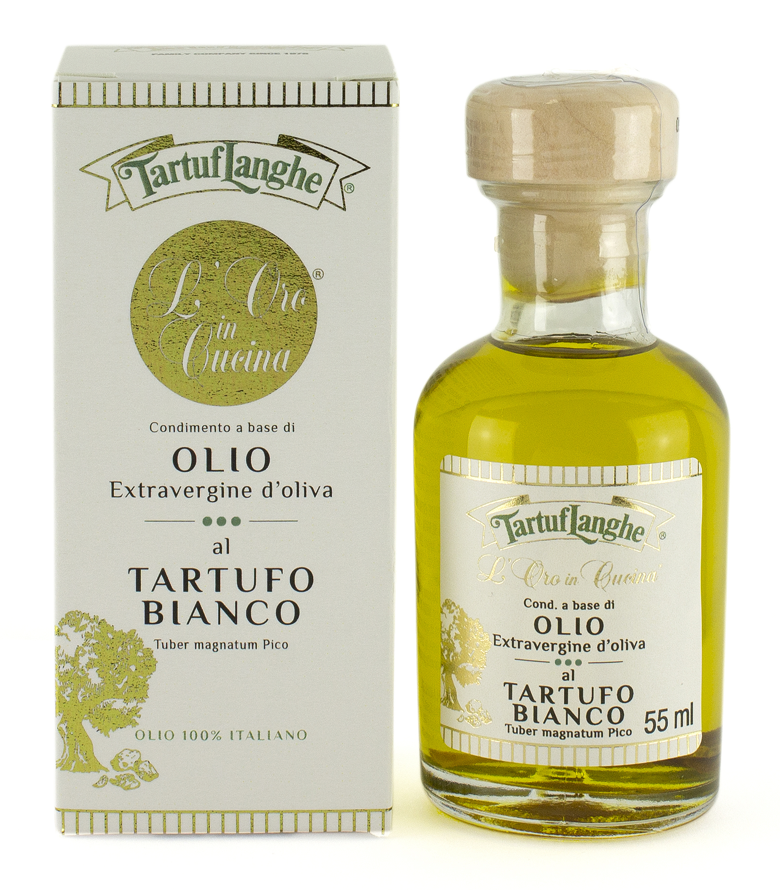 Ingredienti: Olio extravergine d’oliva italiano 99%, tartufo bianco Italiano (Tuber magnatum Pico) liofilizzato 0,15% (pari a 0,9% di prodotto fresco), aroma naturale.