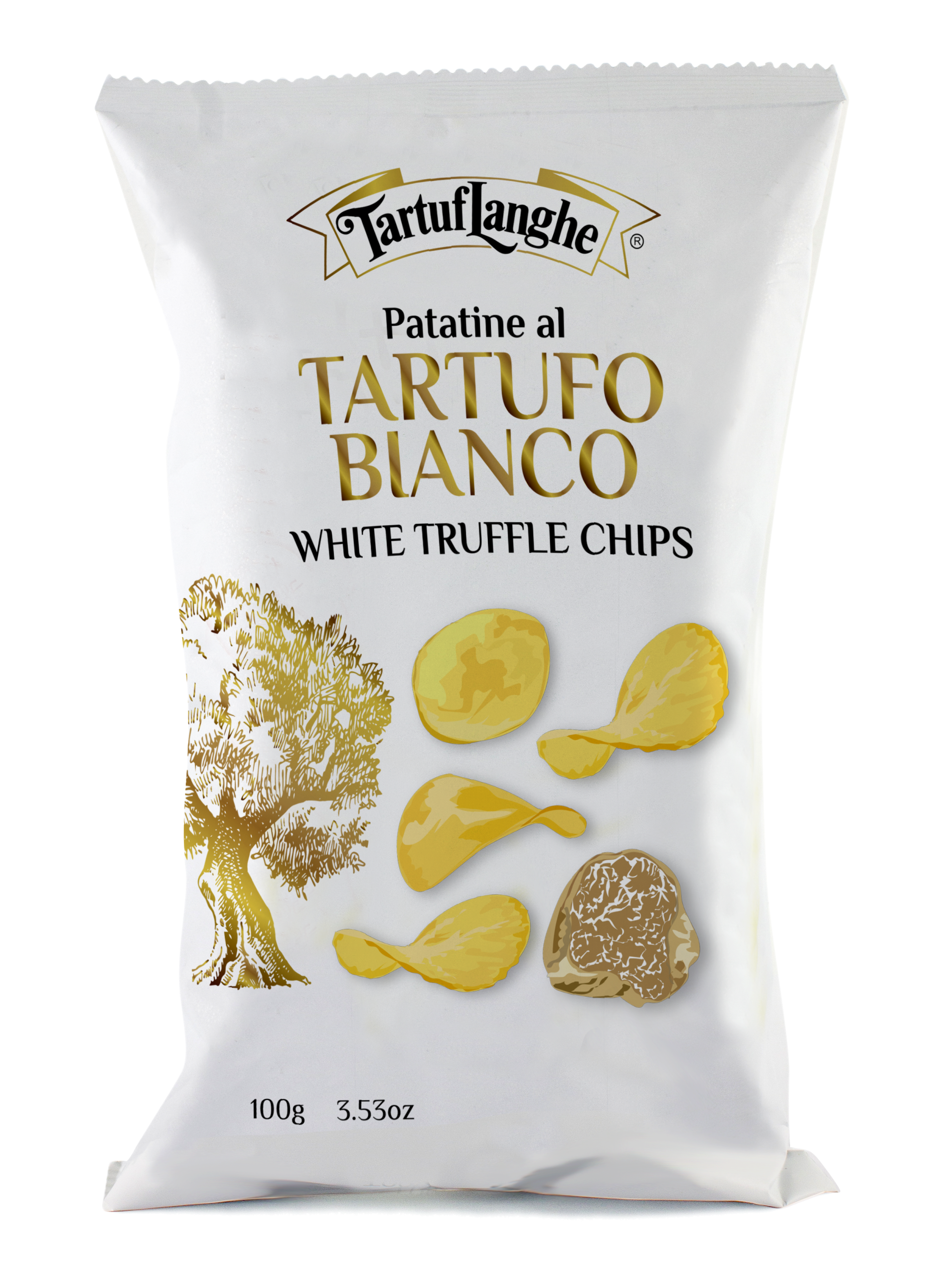 Patatine al tartufo bianco – Ingredienti: patate, olio di girasole, condimento in polvere 2,3% [maltodestrina di patate, sale, aroma naturale, tartufo bianco (Tuber magnatum Pico) liofilizzato 0,5% (pari al 2,5% di tartufo fresco) riferito al condimento], olio d’oliva, sale. SENZA GLUTINE.