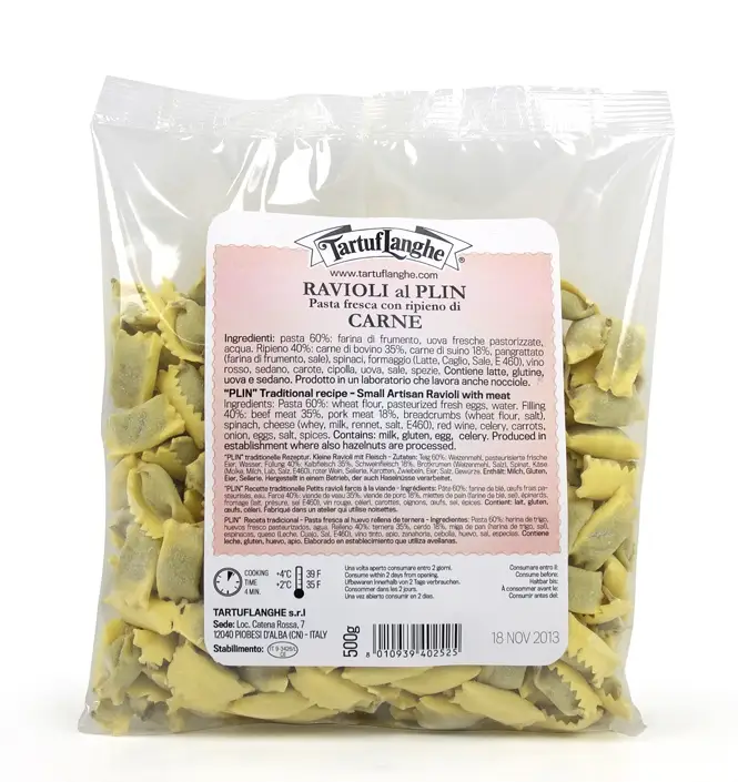 Ingredienti: pasta 60%: farina di FRUMENTO, semola di GRANO duro, UOVA pastorizzate, acqua. Ripieno 40%: carne bovina 35%, carne suina18%, pangrattato (farina di frumento, sale), spinaci, formaggio (LATTE, caglio, sale), vino rosso, SEDANO, carote, cipolla, UOVA, sale, spezie.